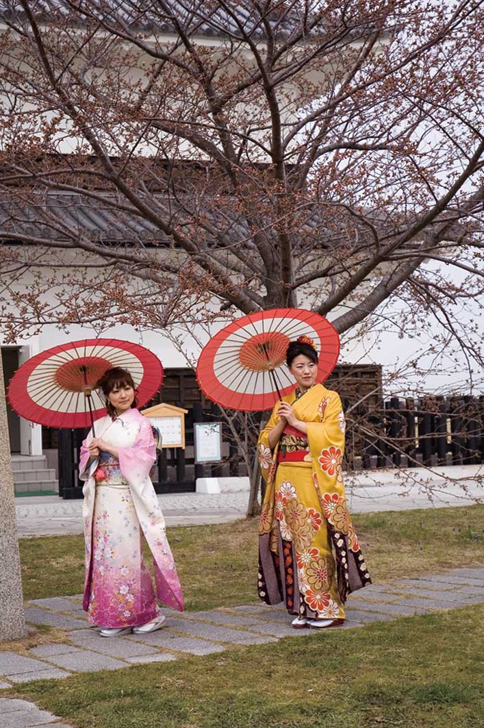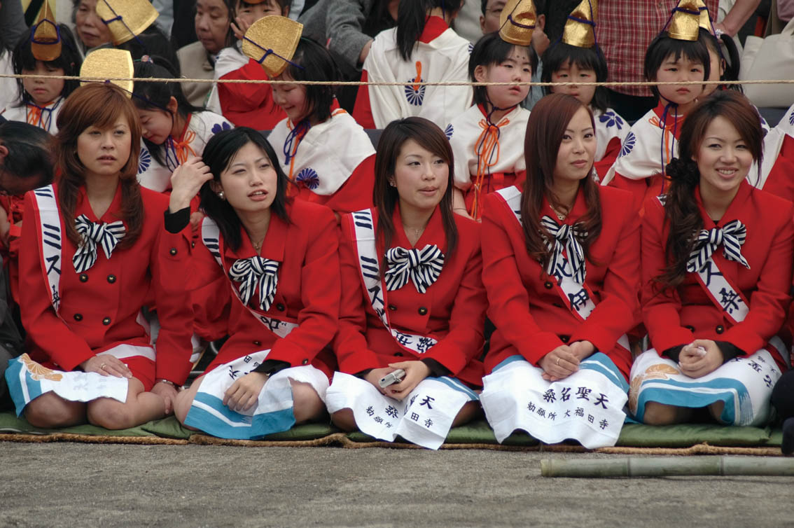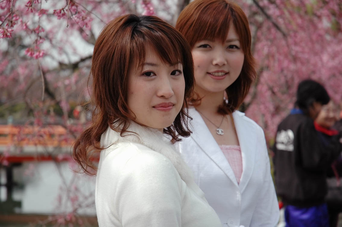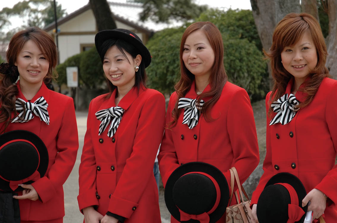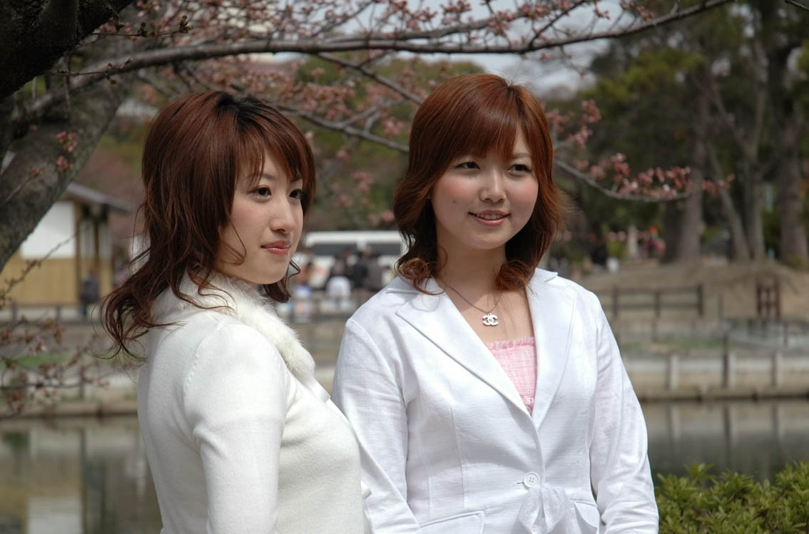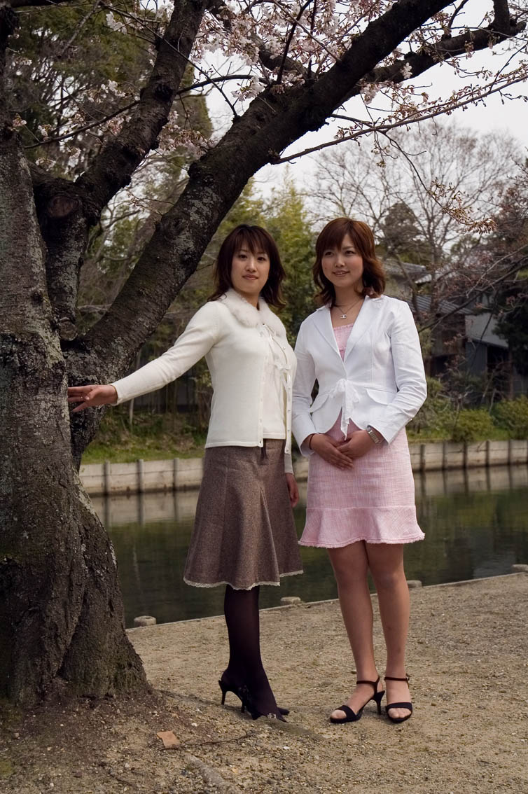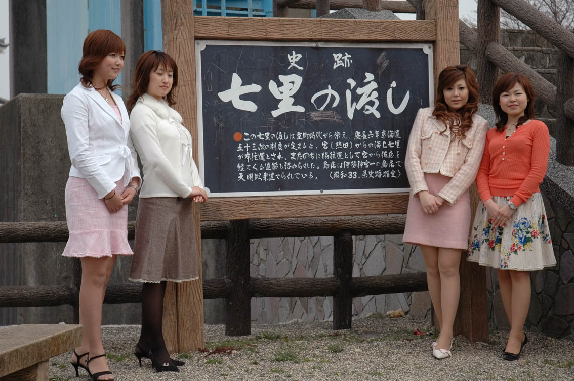 九華公園には、着物姿の2005年ミス桑名が2名、洋服姿の2006年ミス桑名が4名。